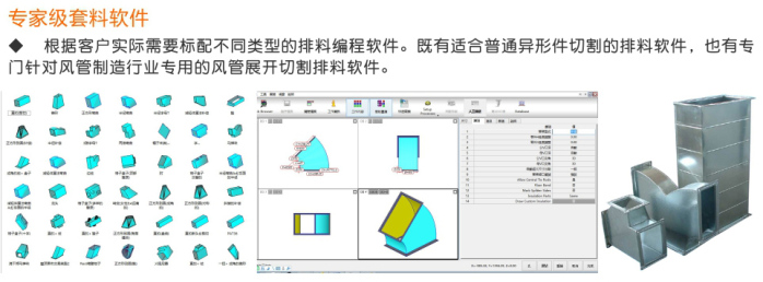 特別針對通風管道行業專門用于切割2mm以下的薄、中碳鋼板、 不銹鋼板、鋁板、銅板、鍍鋅板、白鐵皮、合金板等多種板材材料,快速風管等離子切割機,效果佳、無掛渣和毛刺;在使用時直接連接普通配置的臺式電腦,運用文泰軟件或AutoCAD繪圖軟件直接用于繪制圖形,不需轉換,直接切割,并可進行簡單的排料,工件共邊設置,購買本公司此款設備可享受免費送貨上門、安裝調試及培訓、包教包會!